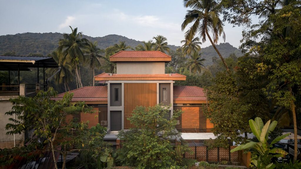 Sloping terracotta-tiled roofs, brick masonry, and the presence of a central courtyard recall familiar domestic typologies, grounding the home in cultural memory.