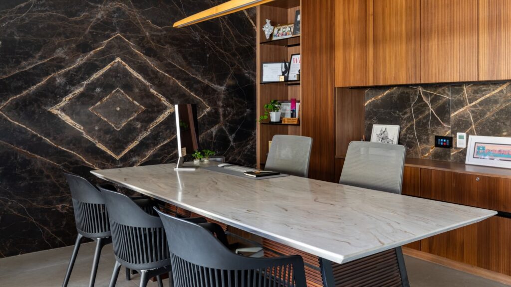 In the Srujan home-office project, material selection plays a central role in defining both atmosphere and function. Different Nexion surfaces are used strategically across the building to respond to the specific needs of each area, reinforcing spatial clarity and visual coherence.