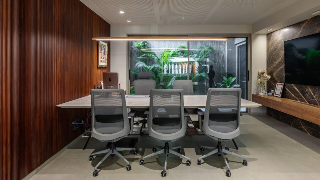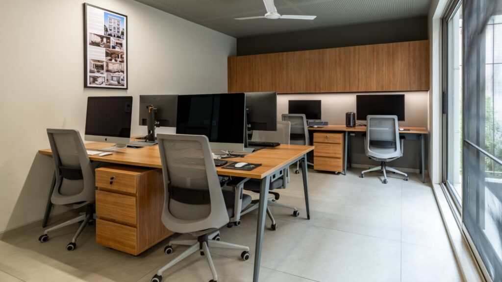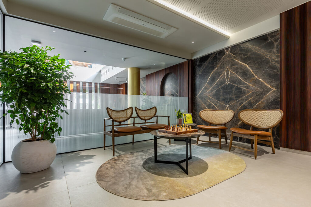 In the office areas, this approach translates into clean lines, controlled material transitions, and a neutral chromatic palette that supports concentration and professional interaction. The environment is designed to feel orderly and focused, where architecture provides a calm backdrop for work-related activities.