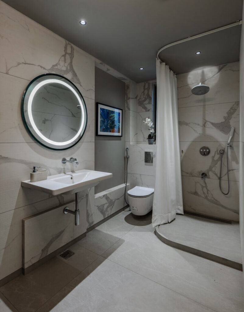For the more intimate residential areas, Essenze Rovere Chiaro is used to add depth and a natural warmth through its wood-inspired surface. Its refined grain and chromatic richness create a sense of comfort and personalization, while preserving the project’s controlled and contemporary aesthetic. In the bathrooms, Statuario Rigato introduces a strong architectural accent, with its bright background and linear veining enhancing verticality and light reflection, giving these spaces a more expressive yet balanced identity.