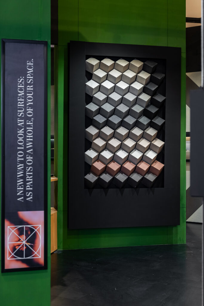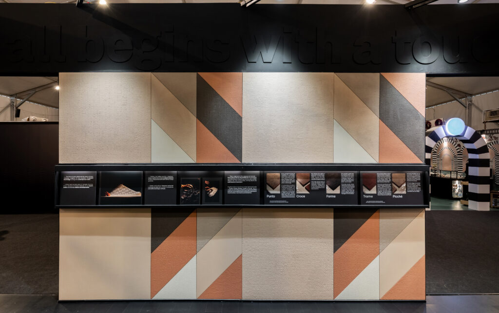 The outer walls showcased the four Ombre structures Punto, Croce, Forme, and Trame – marked with the Ombre logo in Picchè structure, introducing visitors to a gallery of tactile possibilities.