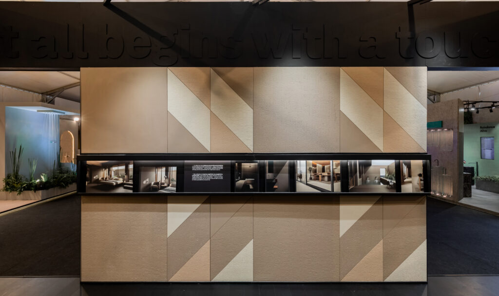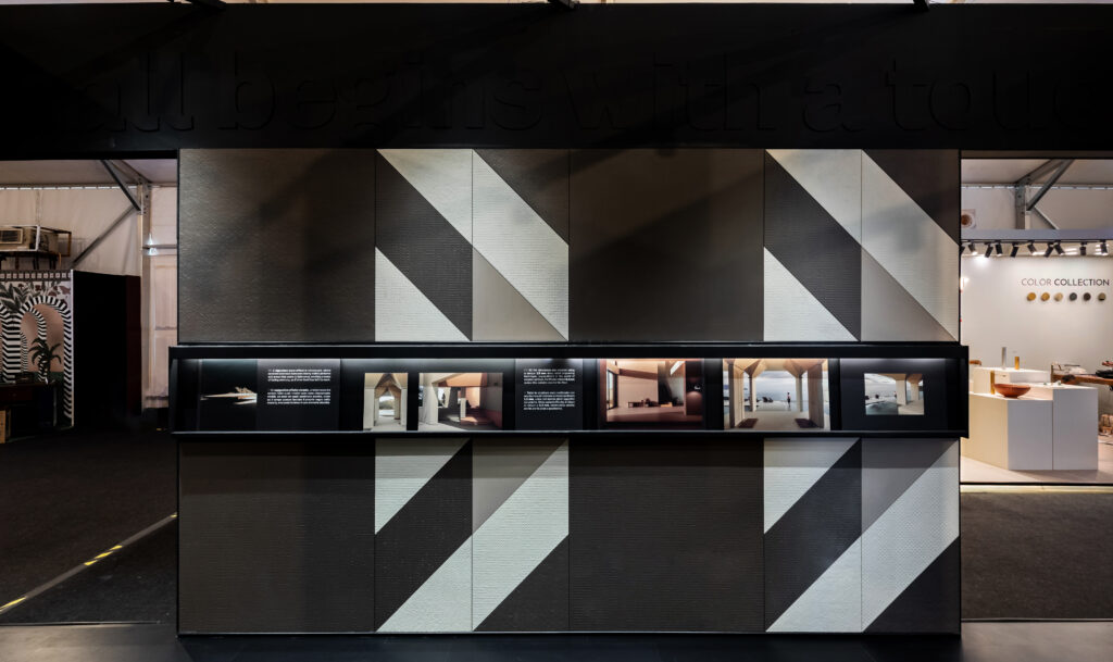 At the heart of our stand, the concept “It all begins with a touch” guided the entire experience. More than a display of surfaces, it unfolded as a sensory journey to be touched, lived, and experienced. Materials were shifted with light and awakened the senses through structure and emotion.