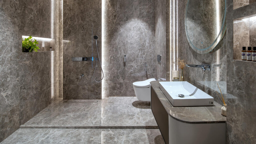 - Emperador Grigio: a subtle touch of tactile luxury, echoing the elegance of marble tiles.