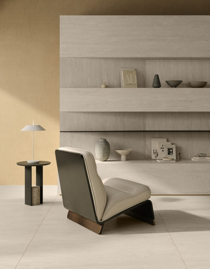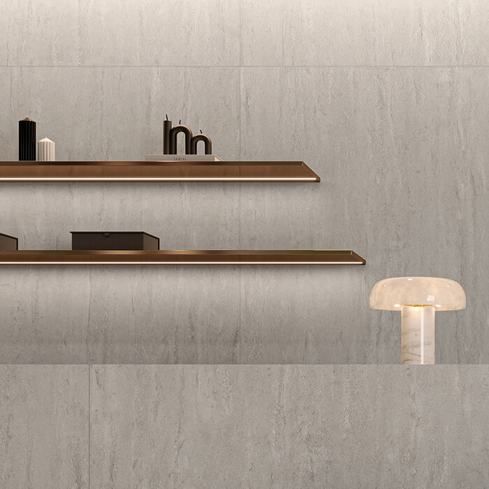 A contemporary tribute to Italian heritage, Travertine Ash reveals a grey base with soft cream and hazelnut veins. Its refined rhythm and balanced texture express natural serenity and timeless elegance, perfect for pure and harmonious interiors.