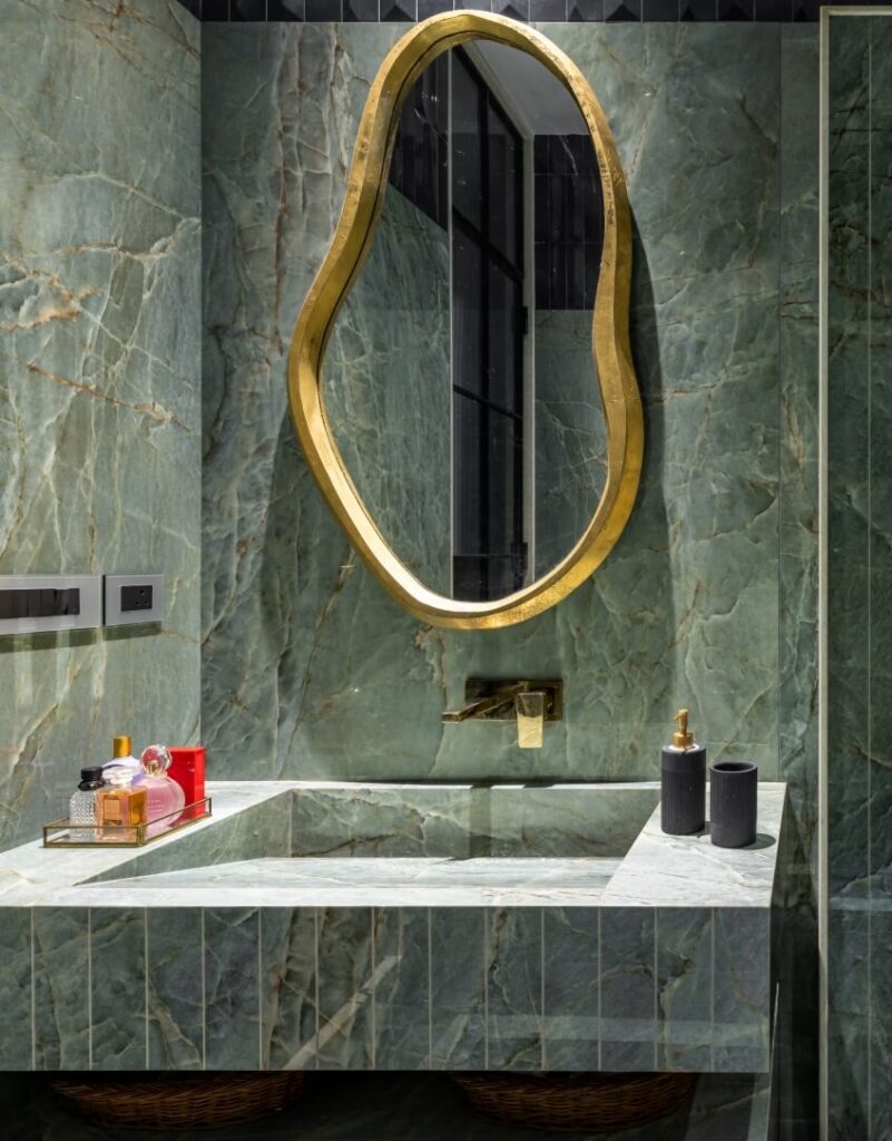 In the bathrooms, Emperador Grigio offers a refined and modern interpretation of ancient stone, its layered greys harmonizing with the coastal terrain and supporting the home’s overall chromatic restraint. Complementing it, the verdant mineral depth of Quarzo Verde Aqua introduces a subtle note of luxury, echoing the dense greenery that surrounds the residence and adding a controlled, expressive contrast within the private spaces.