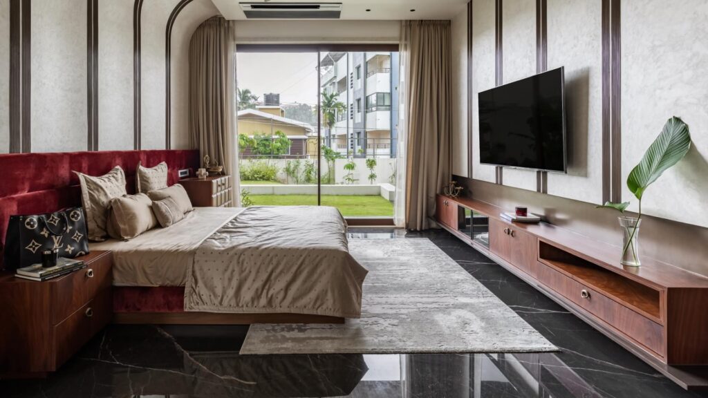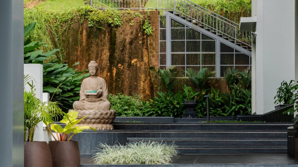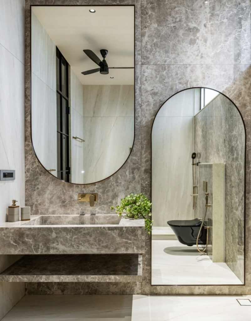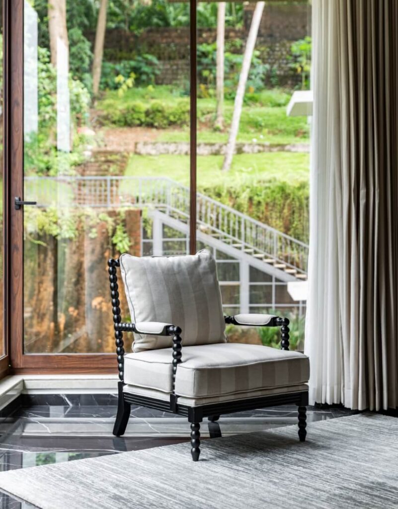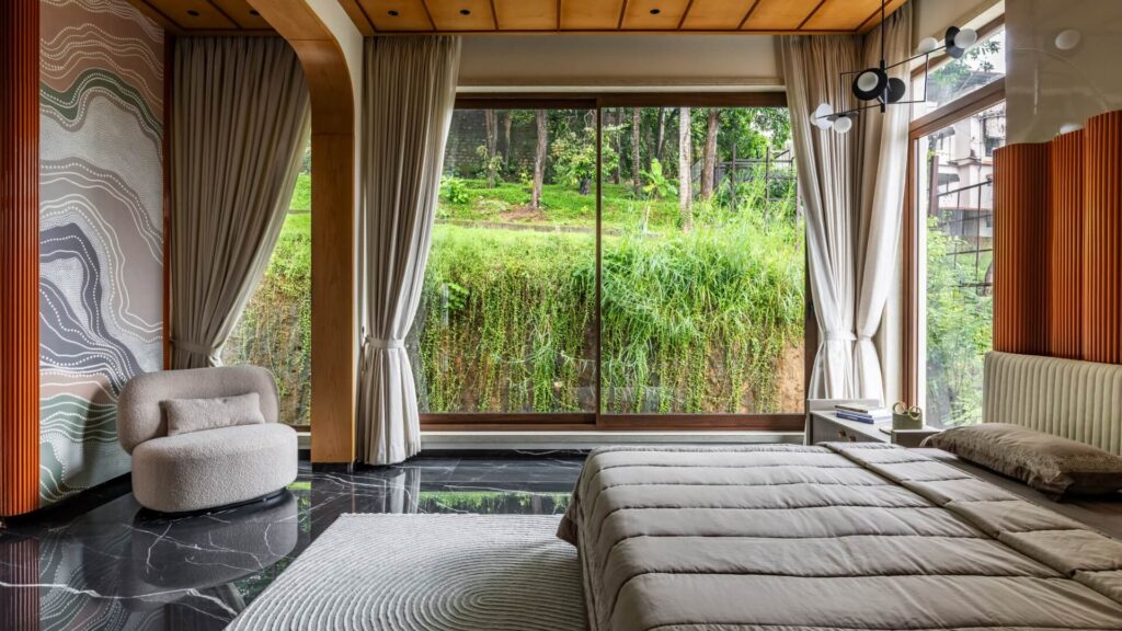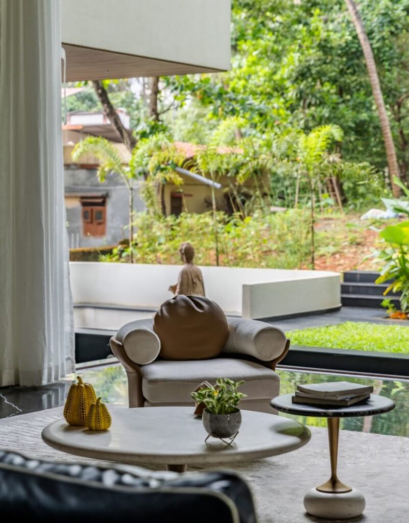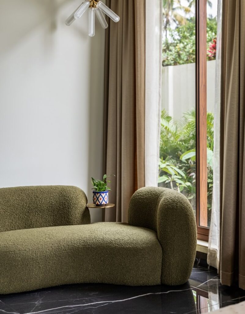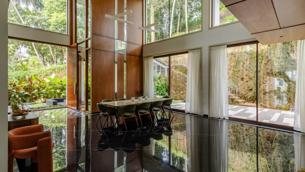 The material strategy reinforces the home’s deep connection to its site, selecting surfaces that echo the tones, textures, and atmospheres of the surrounding environment. Earth-tinted greys, shadowy blacks, and lush mineral greens form a palette that resonates with the soil, foliage, and monsoon light of coastal Karnataka.