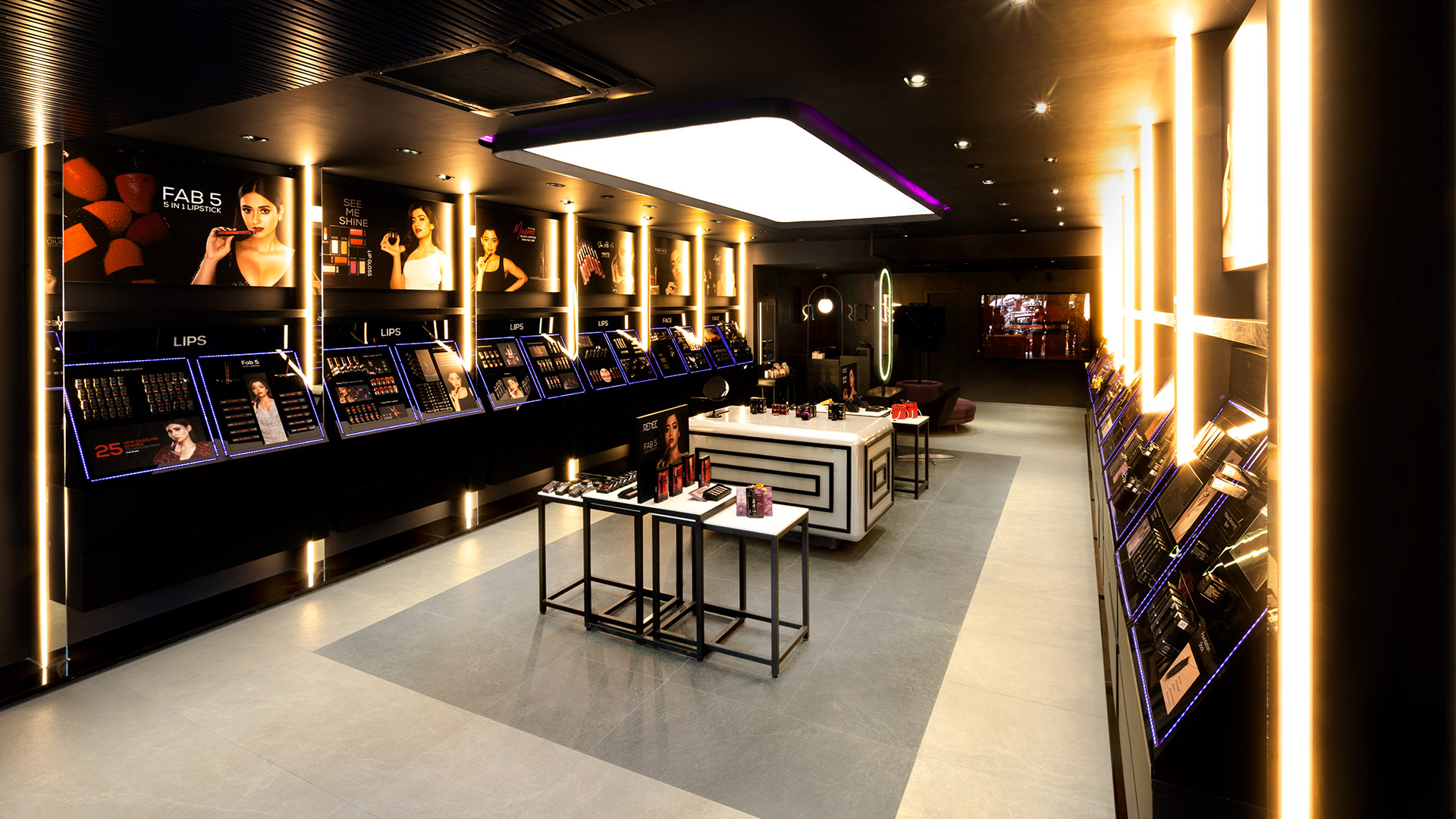 The architectural language is carried forward through an innovative use of Corten steel, cement-textured walls, and a sleek black grid ceiling that discreetly houses essential services.