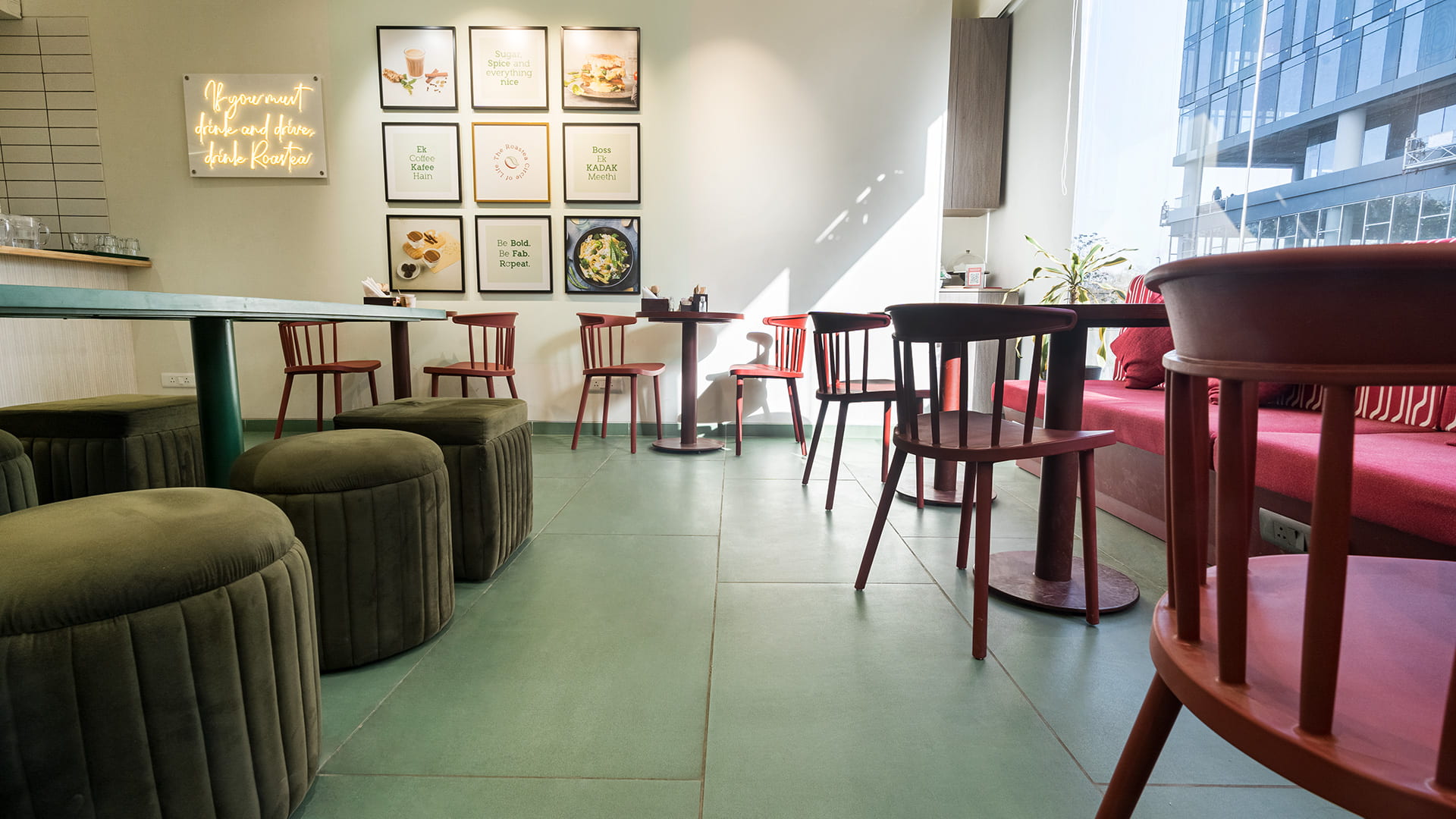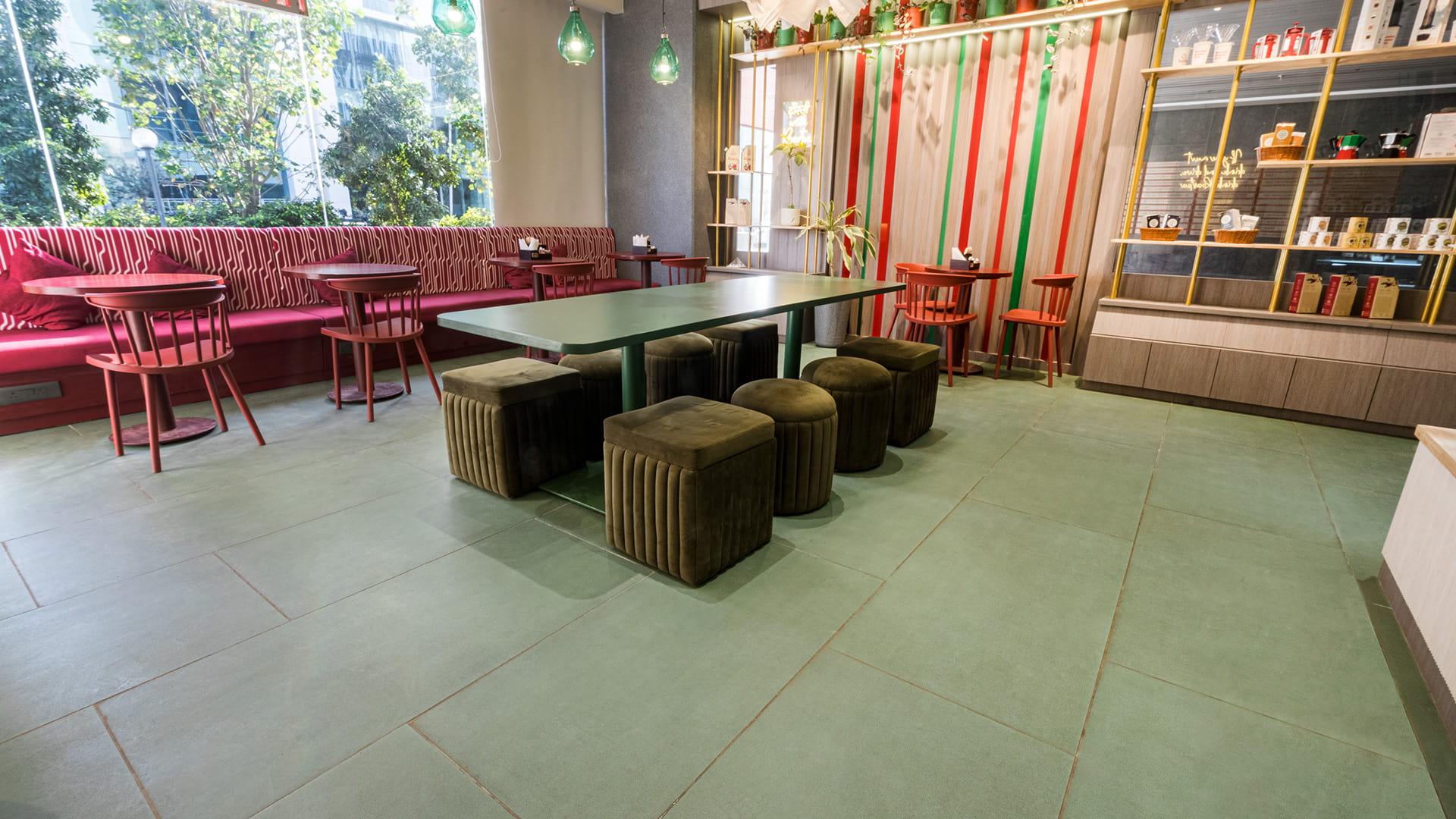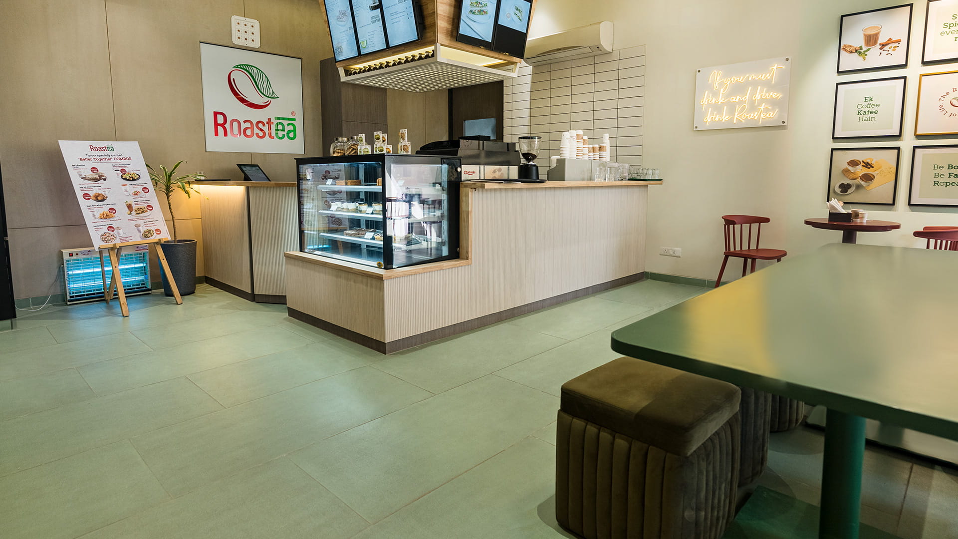 When creating a beautiful café, Roastea, in terms of great aesthetic, design and youthful experience, he decided to use the Terrælino Menta color, inspired by Mint Leaf, for the floor. The Roastea logo has in fact two colors, green and red, which offered him an opportunity to pick up one of the colors out of the brand book itself. As Niraj Shah points out, using green color for the floor allowed to encase a small space, creating a bright and happy feel with whites in it and the wood grain in the counter, making the whole setting very neutral. Combining the Terrælino Menta color with red tables and seats results in a very comforting, warm and welcoming location, without being too bright, unconventional or difficult to digest and working extremely well.
