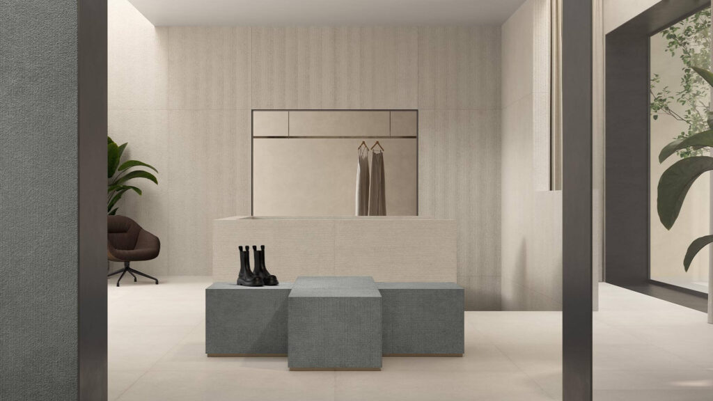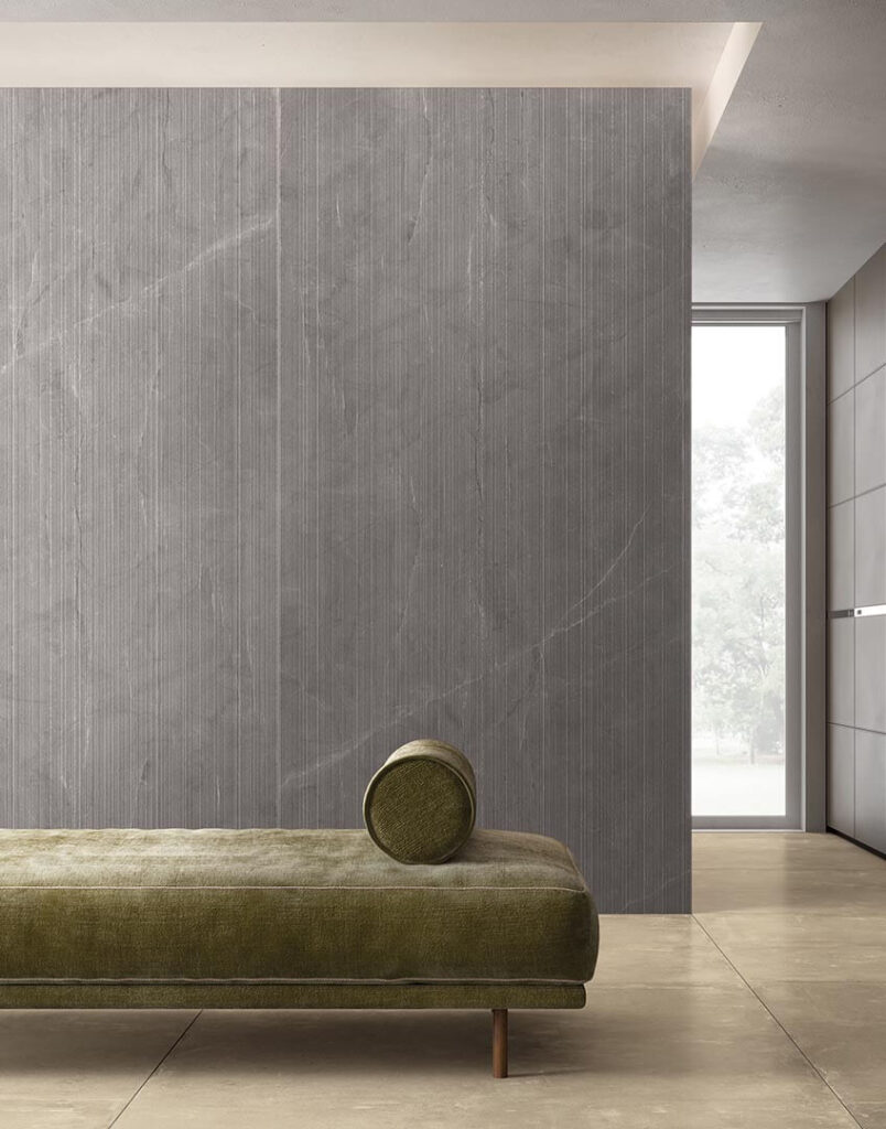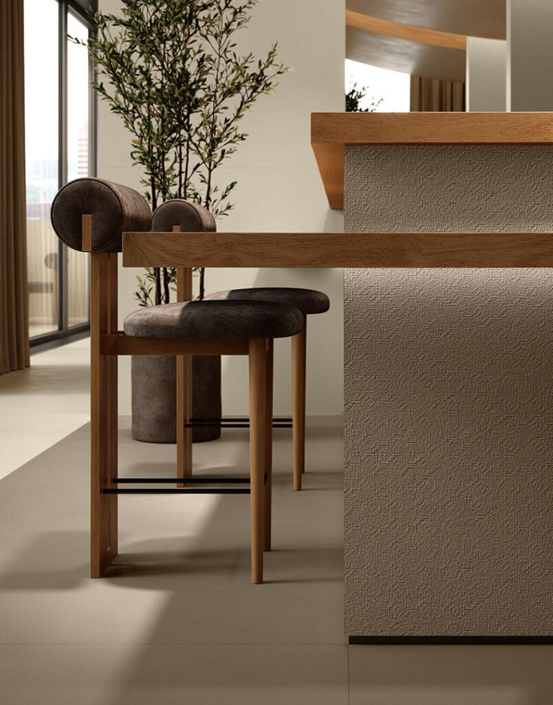 In high-demanding environments like hotels, restaurants, retail spaces, and public interiors, surfaces are designed to leave a lasting impression. The architectural concrete language of Riga, translating the expressive imperfections of handcrafted surfaces into precise geometric rhythm, creates immersivefull-empty sculptural effects where light and shadow define the spatial experience.Where deeper material presence is called for, the intensity and sophistication of Pulpis Grigio commands attention while maintaining the refined restraint that defines luxury hospitality design.